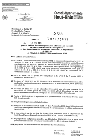 portant fixation des "tarifs journaliers afférents à un ensemble de prestations relatives à l' hébergement" et du "financement des prestations afférentes à la dépendance" de l'EHPAD de l'hôpital de RIBEAUVILLE pour l'année 2019 Resumé Pièces jointes ARRETE Assemblée : Non défini Date : 25/02/2019 Rapporteur : Non défini Collectivité : Conseil départemental du Haut-Rhin Direction : Non défini Service : DGA Développement Humain et Solidarité Domaine : Prix de Journée Commission :