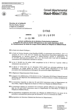 portant notification de la décision d'autorisation budgétaire et fixation des prix de journée hébergement et des tarifs dépendance 2019 de l'établissement de soins de longue durée (ESLD) de l'hôpital de RIBEAUVILLE Resumé Pièces jointes ARRETE Assemblée : Non défini Date : 25/02/2019 Rapporteur : Non défini Collectivité : Conseil départemental du Haut-Rhin Direction : Non défini Service : DGA Développement Humain et Solidarité Domaine : Prix de Journée Commission :