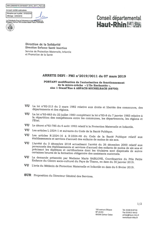 portant modification de l'autorisation de fonctionnement de la micro-crèche "L'Ile Enchantée", sise 1 Grand'Rue à ASPACH-MICHELBACH (68700) Resumé Pièces jointes ARRETE Assemblée : Non défini Date : 07/03/2019 Rapporteur : Non défini Collectivité : Conseil départemental du Haut-Rhin Direction : Non défini Service : DGA Développement Humain et Solidarité Domaine : Accueil d'enfants Commission :