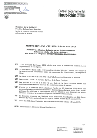 portant modification de l'autorisation de fonctionnement de la micro-crèche "La Boîte à Malices", sise 8 rue de la Chapelle à BISTCHWILLER LES THANN (68620) Resumé Pièces jointes ARRETE Assemblée : Non défini Date : 07/03/2019 Rapporteur : Non défini Collectivité : Conseil départemental du Haut-Rhin Direction : Non défini Service : DGA Développement Humain et Solidarité Domaine : Accueil d'enfants Commission :
