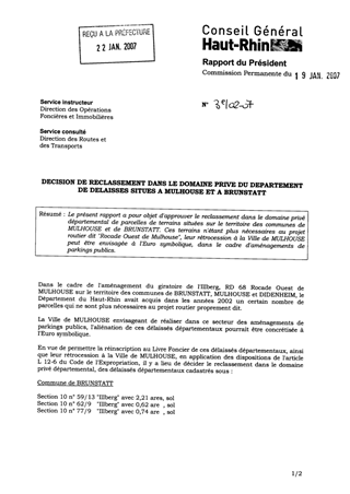 Le présent rapport a pour objet d'approuver le reclassement dans le domaine privé départemental de parcelles de terrains situées sur le territoire des communes de MULHOUSE et de BRUNSTATT. Ces terrains n'étant plus nécessaires au projet routier dit "Rocade Ouest de Mulhouse", leur rétrocession à la Ville de MULHOUSE peut être envisagée à l'Euro symbolique, dans le cadre d'aménagements de parkings publics.