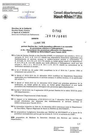 portant fixation des "tarifs journaliers afférents à un ensemble de prestations relatives à l'hébergement" et du "financement des prestations afférentes à la dépendance" de l'EHPAD de SOULTZMATT pour l'année 2019 Resumé Pièces jointes ARRETE Assemblée : Non défini Date : 18/03/2019 Rapporteur : Non défini Collectivité : Conseil départemental du Haut-Rhin Direction : Non défini Service : DGA Développement Humain et Solidarité Domaine : Prix de Journée Commission :