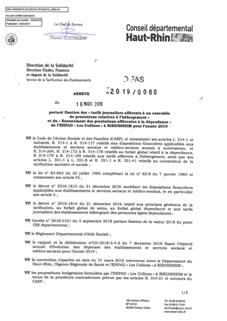portant fixation des "tarifs journaliers afférents à un ensemble de prestations relatives à l'hébergement" et du "financement des prestations afférentes à la dépendance" de l'EHPAD "Les Collines" à RIEDISHEIM pour l'année 2019 Resumé Pièces jointes ARRETE Assemblée : Non défini Date : 18/03/2019 Rapporteur : Non défini Collectivité : Conseil départemental du Haut-Rhin Direction : Non défini Service : DGA Développement Humain et Solidarité Domaine : Prix de Journée Commission :