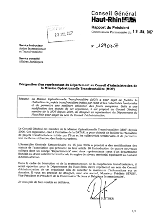 La Mission Opérationnelle Transfrontalière (MOT) a pour objet de faciliter la réalisation de projets transfrontaliers initiés par l'Etat et les collectivités territoriales et de permettre une meilleure utilisation des fonds européens. Suite à une modification des statuts de cet organisme, il est proposé au Conseil Général, membre de la MOT depuis 2006, de désigner un représentant du Département du Haut-Rhin pour siéger au sein du Conseil d'Administration.