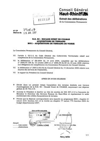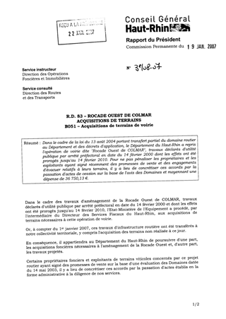 Dans le cadre de la loi du 13 août 2004 portant transfert partiel du domaine routier au Département et des décrets d'application, le Département du Haut Rhin a repris l'opération de voirie dite "Rocade Ouest de COLMAR", travaux déclarés d'utilité publique par arrêté préfectoral en date du 14 février 2000 dont les effets ont été prorogés jusqu'au 14 février 2010. Pour ne pas pénaliser les propriétaires et les exploitants ayant signé récemment des promesses de vente et des engagements d'évacuer relatifs à leurs terrains, il y a lieu de concrétiser ces accords par la passation d'actes de cession sur la base de l'avis des Domaines et moyennant une dépense de 36 750,13 €.