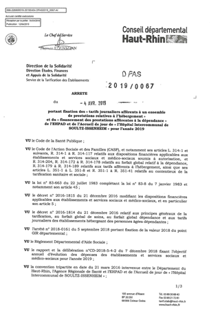 portant fixation des "tarifs journaliers afférents à un ensemble de prestations relatives à l'hébergement" et du "financement des prestations afférentes à la dépendance" de l'EHPAD et de l'accueil de jour de "l'hôpital intercommunal de SOULTZ-ISSENHEIM"
