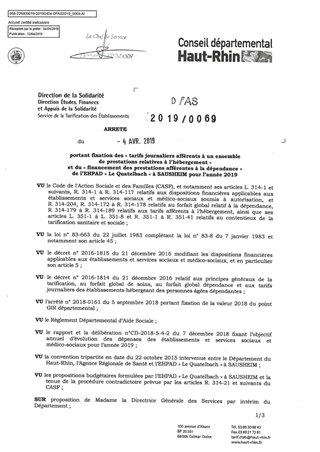portant fixation des "tarifs journaliers afférents à un ensemble de prestations relatives à l'hébergement" et du "financement des prestations afférentes à la dépendance" de l'EHPAD "Le Quatelbach" à SAUSHEIM pour l'année 2019 Resumé Pièces jointes ARRETE Assemblée : Non défini Date : 04/04/2019 Rapporteur : Non défini Collectivité : Conseil départemental du Haut-Rhin Direction : Non défini Service : DGA Développement Humain et Solidarité Domaine : Prix de Journée Commission :