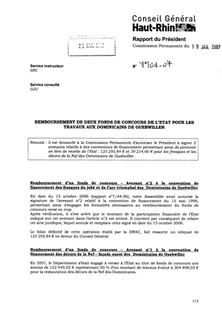 il est demandé à la Commission Permanente d’autoriser le Président à signer 2 avenants relatifs à des conventions de financement permettant ainsi de percevoir en titre de recette de l’Etat : 125 295.84 € et 39 214,60 € pour les fresques et les décors de la Nef des Dominicains de Guebwiller .