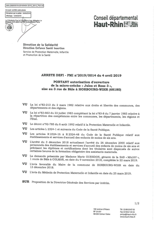 portant autorisation d'ouverture de la micro-crèche "Jules et Rose 3", sis au 3 rue de Bâle à HORBOURG-WIHR (68180) Resumé Pièces jointes ARRETE Assemblée : Non défini Date : 04/04/2019 Rapporteur : Non défini Collectivité : Conseil départemental du Haut-Rhin Direction : Non défini Service : DGA Développement Humain et Solidarité Domaine : Accueil d'enfants Commission :