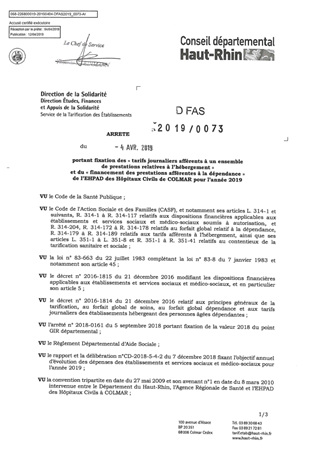 portant fixation des "tarifs journaliers afférents à un ensemble de prestations relatives à l'hébergement" et du "financement des prestations afférentes à la dépendance" de l'EHPAD des hôpitaux civils de COLMAR pour l'année 2019 Resumé Pièces jointes ARRETE Assemblée : Non défini Date : 04/04/2019 Rapporteur : Non défini Collectivité : Conseil départemental du Haut-Rhin Direction : Non défini Service : DGA Développement Humain et Solidarité Domaine : Prix de Journée Commission :