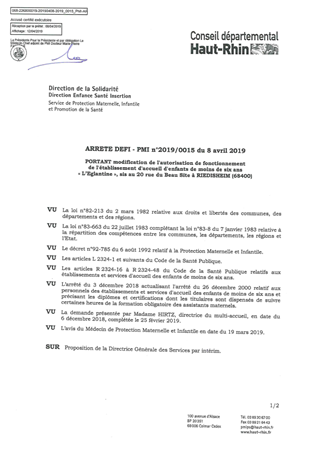 portant modification de l'autorisation de fonctionnement de l'établissement d'accueil d'enfants de moins de six ans "L'Eglantine", sis au 20 rue du Beau Site à RIEDISHEIM (68400) Resumé Pièces jointes ARRETE Assemblée : Non défini Date : 08/04/2019 Rapporteur : Non défini Collectivité : Conseil départemental du Haut-Rhin Direction : Non défini Service : DGA Développement Humain et Solidarité Domaine : Accueil d'enfants Commission :
