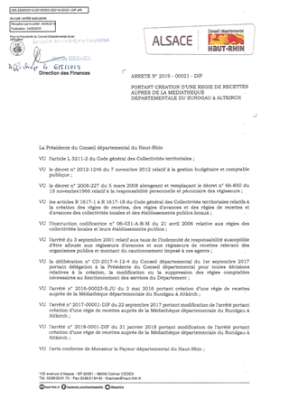 portant création d'une régie de recettes auprès de la médiathèque départementale du Sundgau à ALTKIRCH Resumé Pièces jointes ARRETE Assemblée : Non défini Date : 03/05/2019 Rapporteur : Non défini Collectivité : Conseil départemental du Haut-Rhin Direction : Non défini Service : Direction des Finances Domaine : Autres (non classés) Commission :