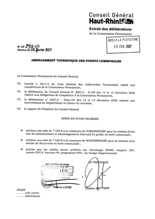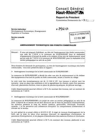 Il vous est proposé d’attribuer, au titre de l’aménagement des forêts communales, une aide de 7 520 € à la commune de DURLINSDORF pour la réalisation d’équipements d’accueil du public et la création d’une aire de stationnement, ainsi qu’une aide de 7 620 € à la commune de WOLFERSDORF, pour la réalisation d’un sentier pédagogique au sein de sa forêt.