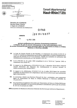 portant notification de la décision d'autorisation budgétaire et fixation du prix de journée hébergement et des tarifs dépendance 2019 du service d'accueil de jour pour personnes âgées de l'association de soins et d'aides Mulhouse et Environs (ASAME)