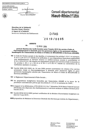 portant fixation des tarifs horaires pour l'année 2019 du service d'aide et d'accompagnement à domicile pour les personnes âgées et les personnes adultes handicapées de l'association de soins et d'aides de MULHOUSE et Environs (ASAME) Resumé Pièces jointes ARRETE Assemblée : Non défini Date : 09/05/2019 Rapporteur : Non défini Collectivité : Conseil départemental du Haut-Rhin Direction : Non défini Service : DGA Développement Humain et Solidarité Domaine : Prix de Journée Commission :