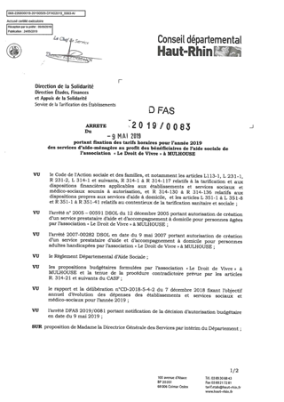 portant fixation des tarifs horaires pour l'année 2019 des services d'aide-ménagère au profit des bénéficiaires de l'aide sociale de l'association "Le Droit de Vivre" à MULHOUSE Resumé Pièces jointes ARRETE Assemblée : Non défini Date : 09/05/2019 Rapporteur : Non défini Collectivité : Conseil départemental du Haut-Rhin Direction : Non défini Service : DGA Développement Humain et Solidarité Domaine : Prix de Journée Commission :