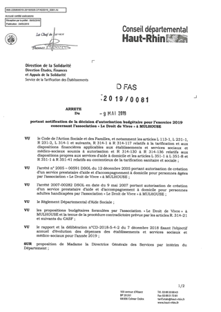 portant notification de la décision d'autorisation budgétaire pour l'exercice 2019 concernant l'association "Le Droit de Vivre" à MULHOUSE Resumé Pièces jointes ARRETE Assemblée : Non défini Date : 09/05/2019 Rapporteur : Non défini Collectivité : Conseil départemental du Haut-Rhin Direction : Non défini Service : DGA Développement Humain et Solidarité Domaine : Dotations financières Commission :