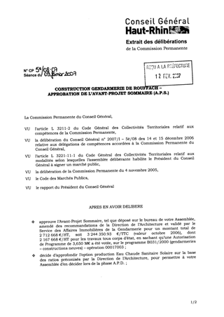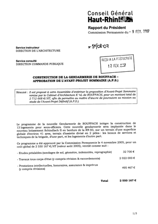 Construction de la gendarmerie de ROUFFACH- Approbation de l'avant projet sommaire (APS)