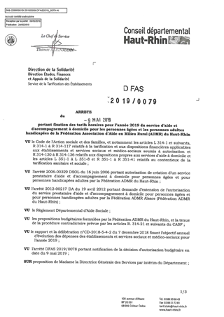 portant fixation des tarifs horaires pour l'année 2019 du service d'aide et d'accompagnement à domicile pour les personnes âgées et les personnes adultes handicapées de la fédération association d'aide en milieu rural (ADMR) du Haut-Rhin Resumé Pièces jointes ARRETE Assemblée : Non défini Date : 09/05/2019 Rapporteur : Non défini Collectivité : Conseil départemental du Haut-Rhin Direction : Non défini Service : DGA Développement Humain et Solidarité Domaine : Prix de Journée Commission :
