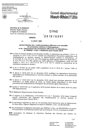 portant fixation des "tarifs journaliers afférents à un ensemble de prestations relatives à l'hébergement" et du "financement des prestations afférentes à la dépendance" de l'EHPAD "L'Arc" à MULHOUSE pour l'année 2019 Resumé Pièces jointes ARRETE Assemblée : Non défini Date : 13/05/2019 Rapporteur : Non défini Collectivité : Conseil départemental du Haut-Rhin Direction : Non défini Service : DGA Développement Humain et Solidarité Domaine : Prix de Journée Commission :