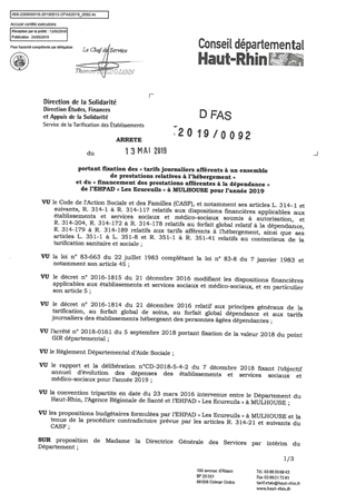 portant fixation des "tarifs journaliers afférents à un ensemble de prestations relatives à l'hébergement" et du "financement des prestations afférentes à la dépendance" de l'EHPAD "Les Ecureuils" à MULHOUSE pour l'année 2019 Resumé Pièces jointes ARRETE Assemblée : Non défini Date : 13/05/2019 Rapporteur : Non défini Collectivité : Conseil départemental du Haut-Rhin Direction : Non défini Service : DGA Développement Humain et Solidarité Domaine : Prix de Journée Commission :