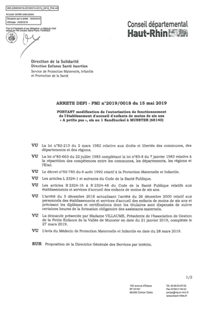 portant modification de l'autorisation de fonctionnement de l'établissement d'accueil d'enfants de moins de six ans "A petits pas", sis au 1 Sandbuckel à MUNSTER (68140) Resumé Pièces jointes ARRETE Assemblée : Non défini Date : 15/05/2019 Rapporteur : Non défini Collectivité : Conseil départemental du Haut-Rhin Direction : Non défini Service : DGA Développement Humain et Solidarité Domaine : Accueil d'enfants Commission :