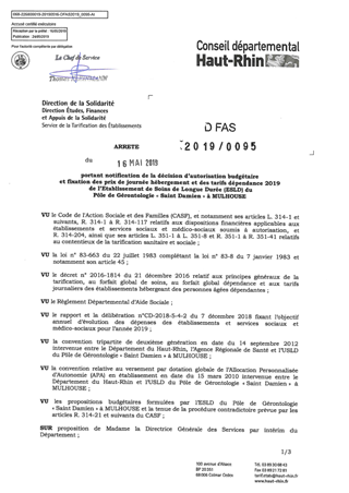portant notification de la décision d'autorisation budgétaire et fixation des prix de journée hébergement et des tarifs dépendance 2019 de l'établissement de soins de longue durée (ESLD) du pôle de gérontologie "Saint Damien" à MULHOUSE Resumé Pièces jointes ARRETE Assemblée : Non défini Date : 16/05/2019 Rapporteur : Non défini Collectivité : Conseil départemental du Haut-Rhin Direction : Non défini Service : DGA Développement Humain et Solidarité Domaine : Prix de Journée Commission :