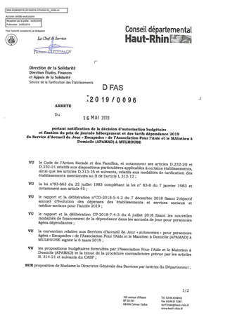 portant notification de la décision d'autorisation budgétaire et fixation du prix de journée hébergement et des tarifs dépendance 2019 du service d'accueil de jour "Escapades" de l'association pour l'aide et le maintien à domicile (APAMAD) à MULHOUSE
