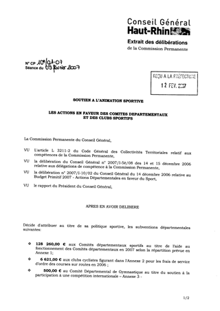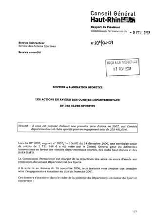 Il vous est proposé d'allouer une première série d'aides en 2007, aux Comités départementaux et clubs sportifs pour un engagement total de 258 481,00 €.
