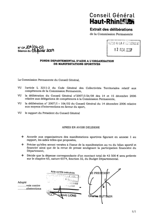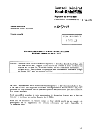 Le Fonds d’aide aux manifestations sportives se déroulant dans le Haut-Rhin a été doté lors du BP 2007, rapport 2007/I-10e/02 de 170 000 €. Cette enveloppe est répartie au cas par cas, en cours d’année, par la Commission Permanente. Le présent rapport vous propose une première série de dossiers à prendre en compte au titre de 2007, pour un montant 43 500 €.
