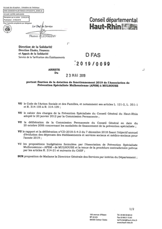 portant fixation de la dotation de fonctionnement 2019 de l'association de prévention spécialisée mulhousienne (APSM) à MULHOUSE Resumé Pièces jointes ARRETE Assemblée : Non défini Date : 23/05/2019 Rapporteur : Non défini Collectivité : Conseil départemental du Haut-Rhin Direction : Non défini Service : DGA Développement Humain et Solidarité Domaine : Dotations financières Commission :