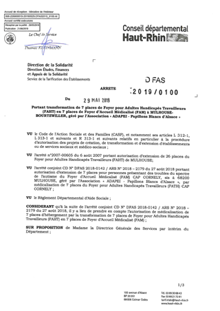 portant transformation de 7 places de foyer pour adultes handicapés travailleurs (FAHT) en 7 places de foyer d'accueil médicalisé (FAM) à MULHOUSE-BOURTZWILLER, géré par l'association "ADAPEI-Papillons Blancs d'Alsace" Resumé Pièces jointes ARRETE Assemblée : Non défini Date : 29/05/2019 Rapporteur : Non défini Collectivité : Conseil départemental du Haut-Rhin Direction : Non défini Service : DGA Développement Humain et Solidarité Domaine : Autres (non classés) Commission :