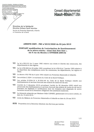 portant modification de l'autorisation de fonctionnement de la micro-crèche "Ainsi font font font", sis 5 rue du Moulin à UFFHEIM (68510) Resumé Pièces jointes ARRETE Assemblée : Non défini Date : 03/06/2019 Rapporteur : Non défini Collectivité : Conseil départemental du Haut-Rhin Direction : Non défini Service : DGA Développement Humain et Solidarité Domaine : Accueil d'enfants Commission :