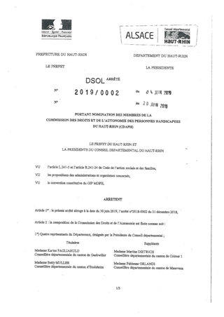 portant nomination des membres de la commission des droits et de l'autonomie des personnes handicapées du Haut-Rhin (CDAPH) Resumé Pièces jointes ARRETE Assemblée : Non défini Date : 04/06/2019 Rapporteur : Non défini Collectivité : Conseil départemental du Haut-Rhin Direction : Non défini Service : Direction de l'Autonomie Domaine : Autres (non classés) Commission :