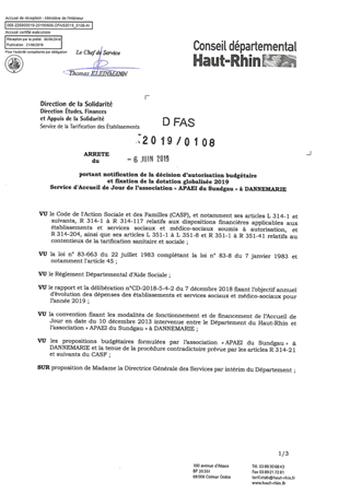 portant notification de la décision d'autorisation budgétaire et fixation de la dotation globalisée 2019 Service d'accueil de jour de l'association "APAEI du Sundgau" à DANNEMARIE Resumé Pièces jointes ARRETE Assemblée : Non défini Date : 06/06/2019 Rapporteur : Non défini Collectivité : Conseil départemental du Haut-Rhin Direction : Non défini Service : DGA Développement Humain et Solidarité Domaine : Dotations financières Commission :