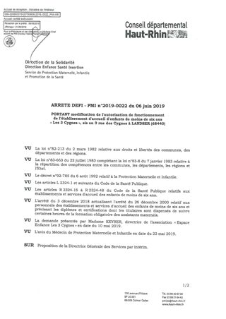 portant modification de l'autorisation de fonctionnement de l'établissement d'accueil d'enfants de moins de six ans "Les 3 Cygnes", sis au 3 rue des Cygnes à LANDSER (68440) Resumé Pièces jointes ARRETE Assemblée : Non défini Date : 06/06/2019 Rapporteur : Non défini Collectivité : Conseil départemental du Haut-Rhin Direction : Non défini Service : DGA Développement Humain et Solidarité Domaine : Accueil d'enfants Commission :