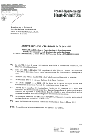 portant modification de l'autorisation de fonctionnement de l'établissement d'accueil d'enfants de moins de six ans "Crèche Caroline Fritz", sis au 27 rue du Chanoine Cetty à MULHOUSE (68200) Resumé Pièces jointes ARRETE Assemblée : Non défini Date : 06/06/2019 Rapporteur : Non défini Collectivité : Conseil départemental du Haut-Rhin Direction : Non défini Service : DGA Développement Humain et Solidarité Domaine : Accueil d'enfants Commission :