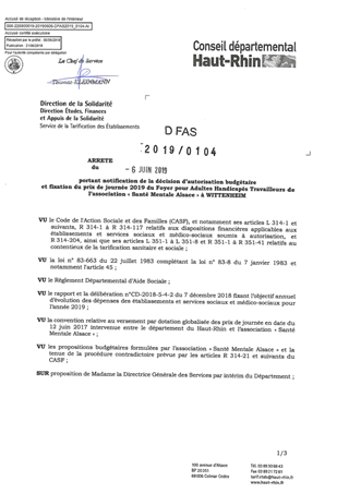 portant notification de la décision d'autorisation budgétaire et fixation du prix de journée 2019 du foyer pour adultes handicapés travailleurs de l'association "Santé Mentale Alsace" à WITTENHEIM Resumé Pièces jointes ARRETE Assemblée : Non défini Date : 06/06/2019 Rapporteur : Non défini Collectivité : Conseil départemental du Haut-Rhin Direction : Non défini Service : DGA Développement Humain et Solidarité Domaine : Prix de Journée Commission :