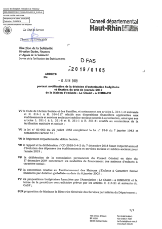 portant notification de la décision d'autorisation budgétaire et fixation du prix de journée 2019 de la Maison d'enfants "Le Chalet" à RIMBACH Resumé Pièces jointes ARRETE Assemblée : Non défini Date : 06/06/2019 Rapporteur : Non défini Collectivité : Conseil départemental du Haut-Rhin Direction : Non défini Service : DGA Développement Humain et Solidarité Domaine : Prix de Journée Commission :