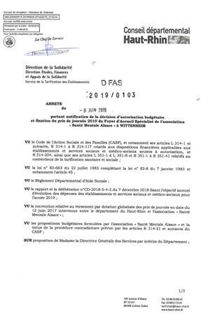 portant notification de la décision d'autorisation budgétaire et fixation du prix de journée 2019 du foyer d'accueil spécialisé et l'association "Santé Mentale Alsace" à WITTENHEIM Resumé Pièces jointes ARRETE Assemblée : Non défini Date : 06/06/2019 Rapporteur : Non défini Collectivité : Conseil départemental du Haut-Rhin Direction : Non défini Service : DGA Développement Humain et Solidarité Domaine : Prix de Journée Commission :