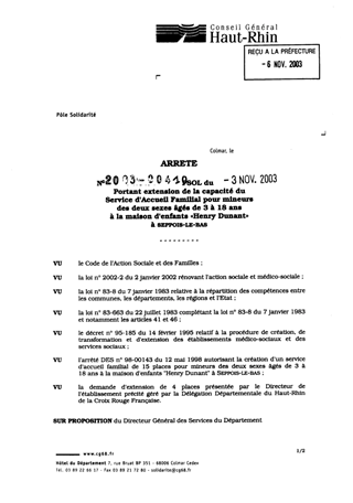 portant extension de la capacité du service d'accueil familial pour mineurs des deux sexes âgés de 3 à 18 ans à la maison d'enfants "Henry Dunant" à SEPPOIS LE BAS. Resumé Pièces jointes ARRETE Assemblée : Non défini Date : 03/11/2003 Rapporteur : Non défini Collectivité : Conseil départemental du Haut-Rhin Direction : Non défini Service : Direction de la Solidarité Domaine : Accueil d'enfants Commission :