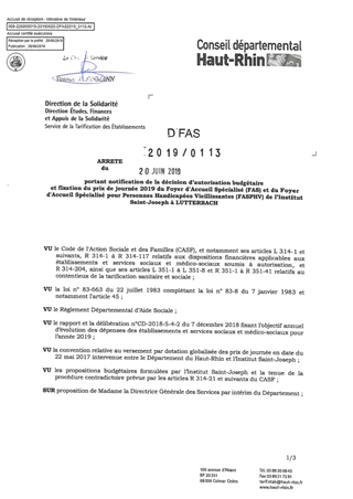ortant notification de la décision d'autorisation budgétaire et fixation du prix de journée 2019 du foyer d'accueil spécialisé (FAS) et du foyer d'accueil spécialisé pour personnes handicapées vieillissantes (FASPHV) de l'institut St-Joseph à LUTTERBACH