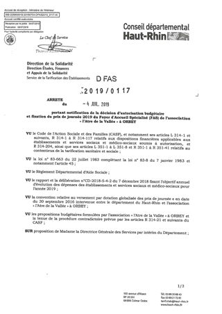 portant notification de la décision d'autorisation budgétaire et fixation du prix de journée 2019 du foyer d'accueil spécialisé (FAS) de l'association "l'Atre de la Vallée" à ORBEY Resumé Pièces jointes ARRETE Assemblée : Non défini Date : 04/07/2019 Rapporteur : Non défini Collectivité : Conseil départemental du Haut-Rhin Direction : Non défini Service : DGA Développement Humain et Solidarité Domaine : Prix de Journée Commission :