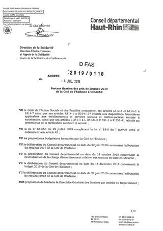 portant fixation des prix de journée 2019 de la Cité de l'Enfance à COLMAR Resumé Pièces jointes ARRETE Assemblée : Non défini Date : 04/07/2019 Rapporteur : Non défini Collectivité : Conseil départemental du Haut-Rhin Direction : Non défini Service : DGA Développement Humain et Solidarité Domaine : Prix de Journée Commission :