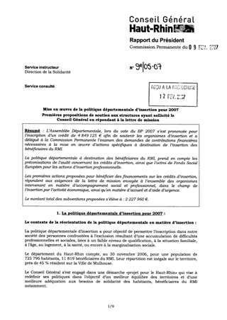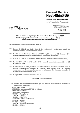 L’Assemblée Départementale, lors du vote du BP 2007 s’est prononcée pour l’inscription d’un crédit de 4 849 125 € afin de soutenir les organismes d’insertion et a délégué à la Commission Permanente l’examen des demandes de contributions financières nécessaires à la mise en œuvre d’actions spécifiques à destination de l’insertion des bénéficiaires du RMI. La politique départementale à destination des bénéficiaires du RMI, prend en compte les préconisations de l’audit concernant les crédits d’insertion, ainsi que l’octroi de Fonds Social Européen pour les actions d’insertion professionnelle. Les premières actions proposées pour bénéficier des financements sur les crédits d’insertion, répondent aux exigences de la lettre de mission envoyée à l’ensemble des organismes intervenant en matière d’accompagnement social et professionnel, dans le champ de l’insertion par l’activité économique, ainsi qu’en matière d’accueil et d’aide d’urgence. Le montant total des subventions proposées s’élève à : 2 227 960 €.