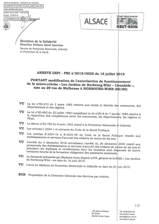 portant modification de l'autorisation de fonctionnement de la micro-crèche "Les Jardins de Horbourg-Wihr - Lionskids", sise au 20 rue de Mulhouse à HORBOURG WIHR (68180) Resumé Pièces jointes ARRETE Assemblée : Non défini Date : 15/07/2019 Rapporteur : Non défini Collectivité : Conseil départemental du Haut-Rhin Direction : Non défini Service : Direction Enfance Famille Insertion Domaine : Accueil d'enfants Commission :
