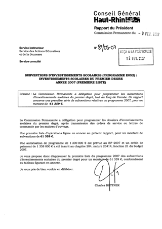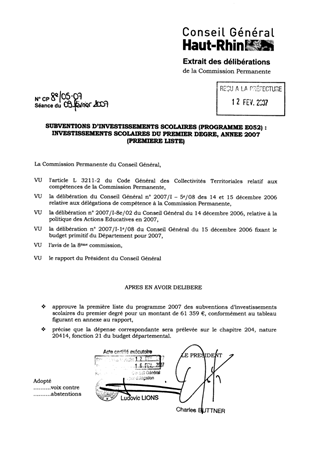 La Commission Permanente a délégation pour programmer les subventions d’investissements scolaires du premier degré, tout au long de l’année. Ce rapport concerne une première série de subventions relatives au programme 2007, pour un montant de 61 359 €.