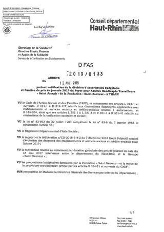 portant notification de la décision d'autorisation budgétaire et fixation du prix de journée 2019 du foyer pour adultes handicapés travailleurs "Saint Joseph" de la fondation "Saint Sauveur" à THANN Resumé Pièces jointes ARRETE Assemblée : Non défini Date : 12/08/2019 Rapporteur : Non défini Collectivité : Conseil départemental du Haut-Rhin Direction : Non défini Service : Direction Ressources Solidarité Domaine : Prix de Journée Commission :