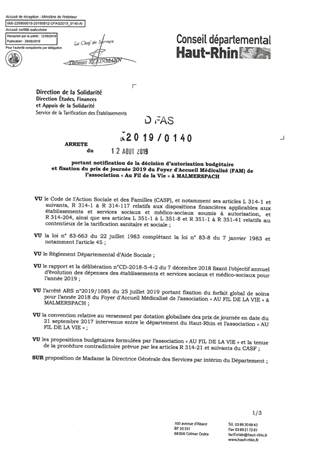 portant notification de la décision d'autorisation budgétaire et fixation du prix de journée 2019 du foyer d'accueil médicalisé (FAM) de l'association "Au fil de la Vie" à MALMERSPACH Resumé Pièces jointes ARRETE Assemblée : Non défini Date : 12/08/2019 Rapporteur : Non défini Collectivité : Conseil départemental du Haut-Rhin Direction : Non défini Service : Direction Ressources Solidarité Domaine : Prix de Journée Commission :