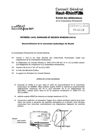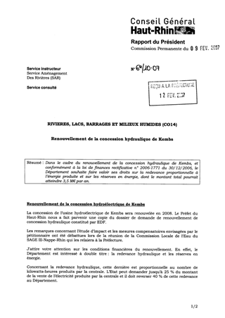 Dans le cadre du renouvellement de la concession hydraulique de Kembs, et conformément à la loi de finances rectificative n° 2006-1771 du 30/12/2006, le Département souhaite faire valoir ses droits sur la redevance proportionnelle à l’énergie produite et sur les réserves en énergie, dont le montant total pourrait atteindre 3,5 M€ par an.